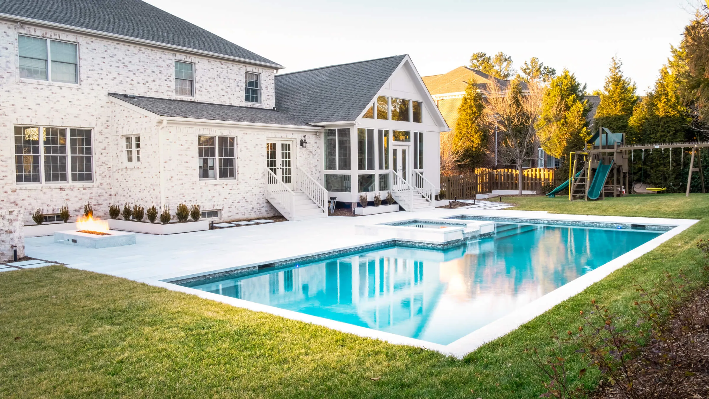 The design features a 400,000 BTU fireplace that anchors the patio and allows the space to be used comfortably well into cooler evenings. Ample seating was incorporated to support hosting and casual lounging, with careful attention paid to sightlines, scale, and flow between the patio and pool. The result is a modern outdoor living area that balances warmth, functionality, and visual impact while enhancing how the homeowners use their backyard.