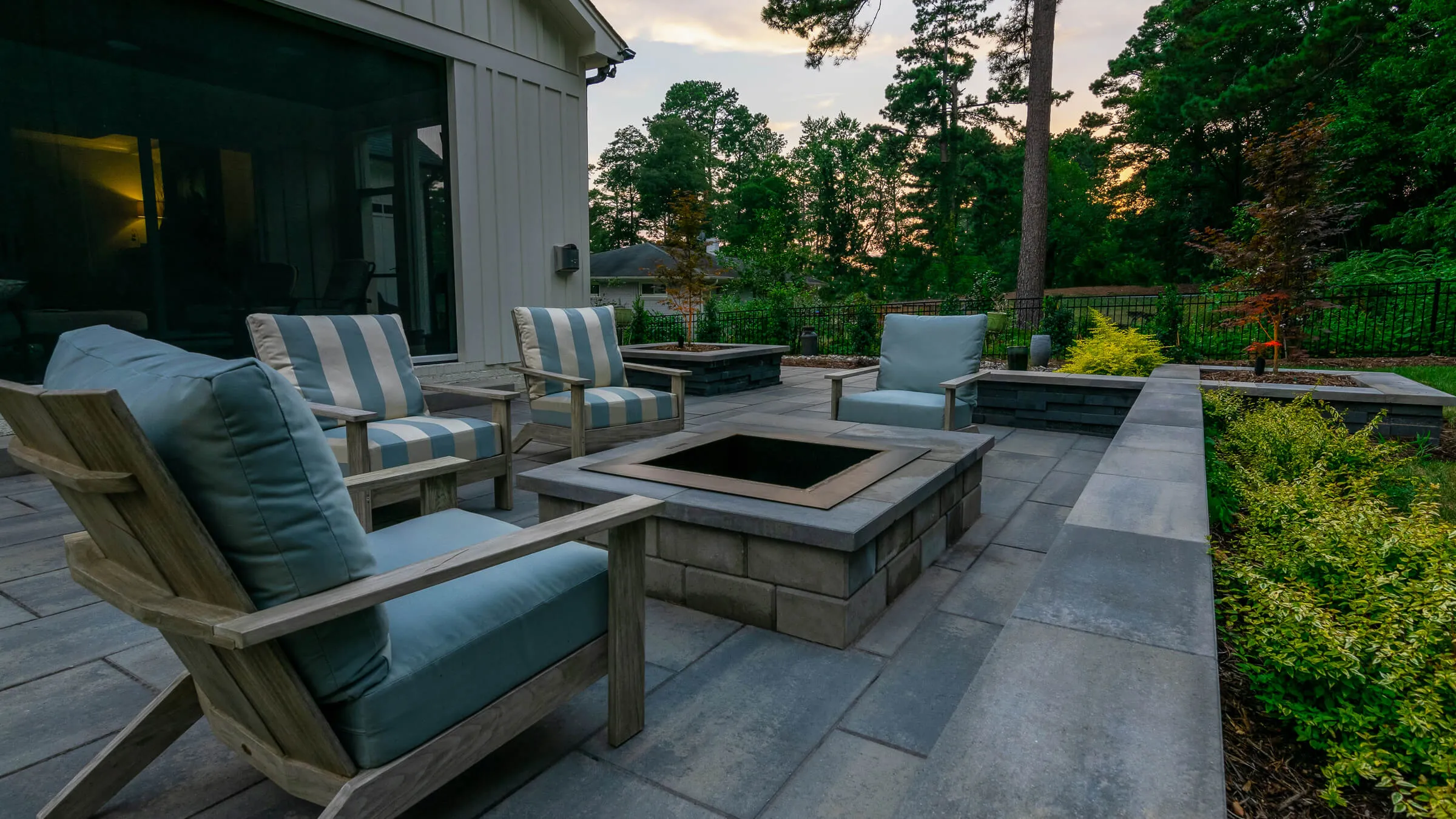 This project started small and became a truly beautiful outdoor space. We built a seating wall that also doubled as a retaining wall to level out the yard.