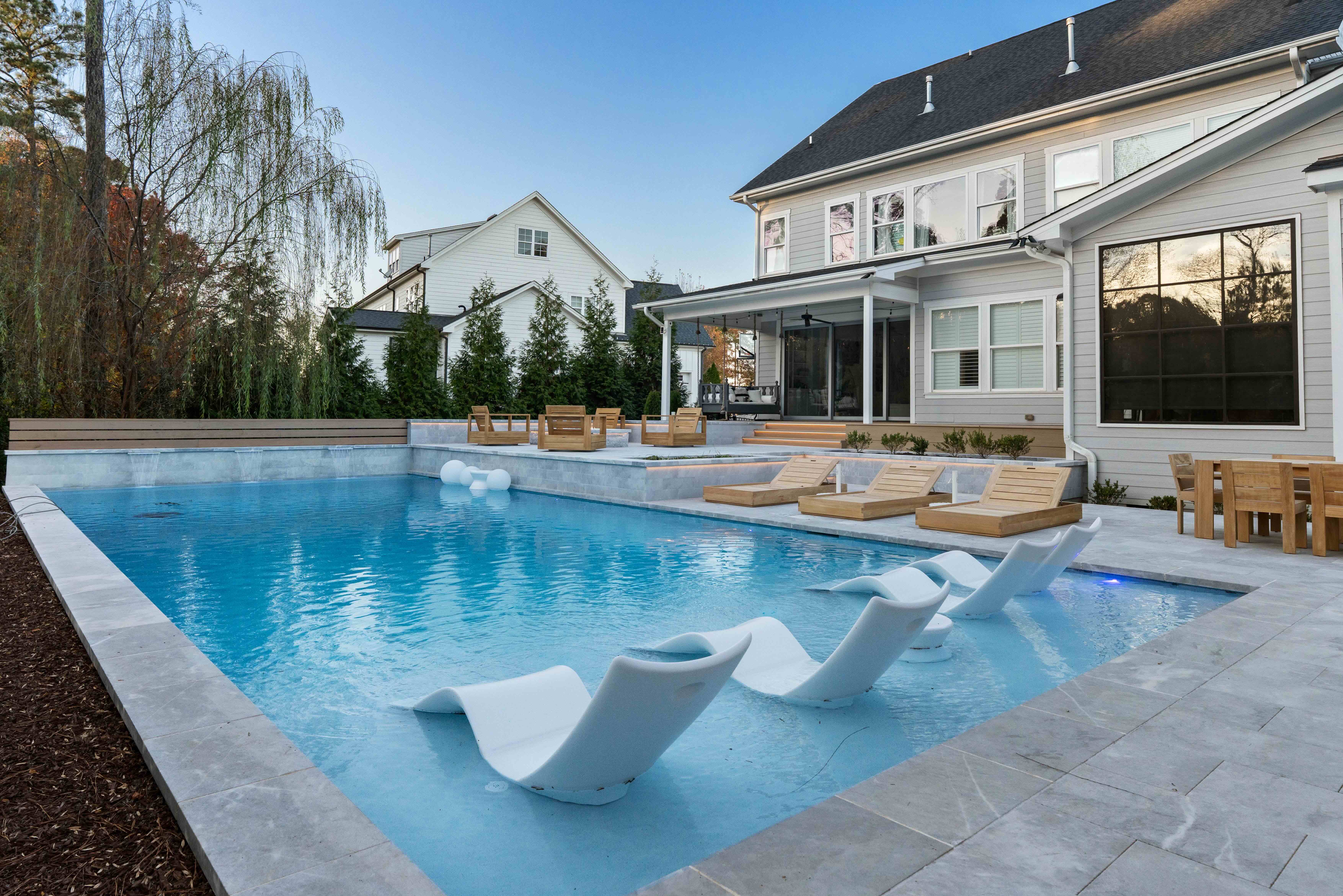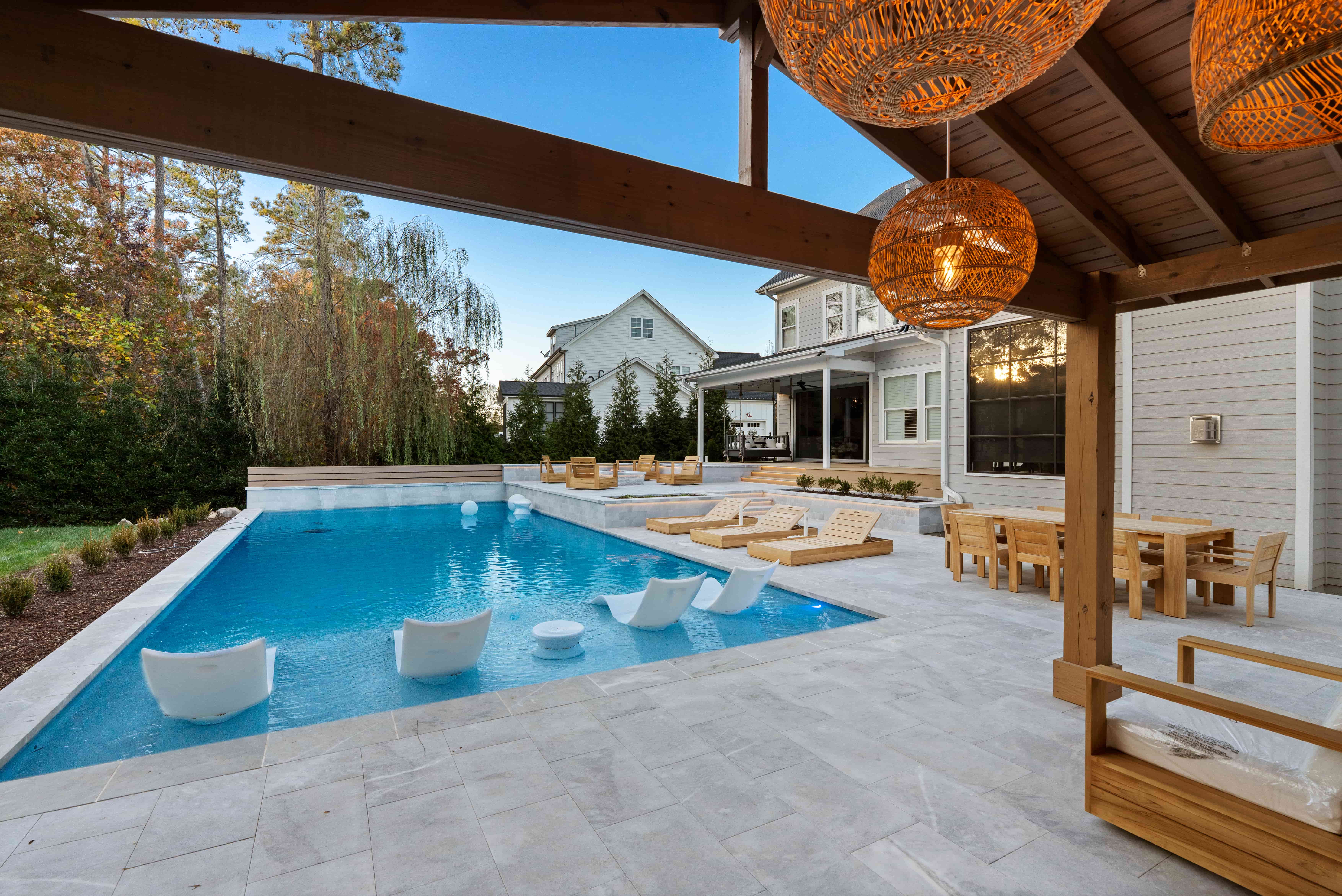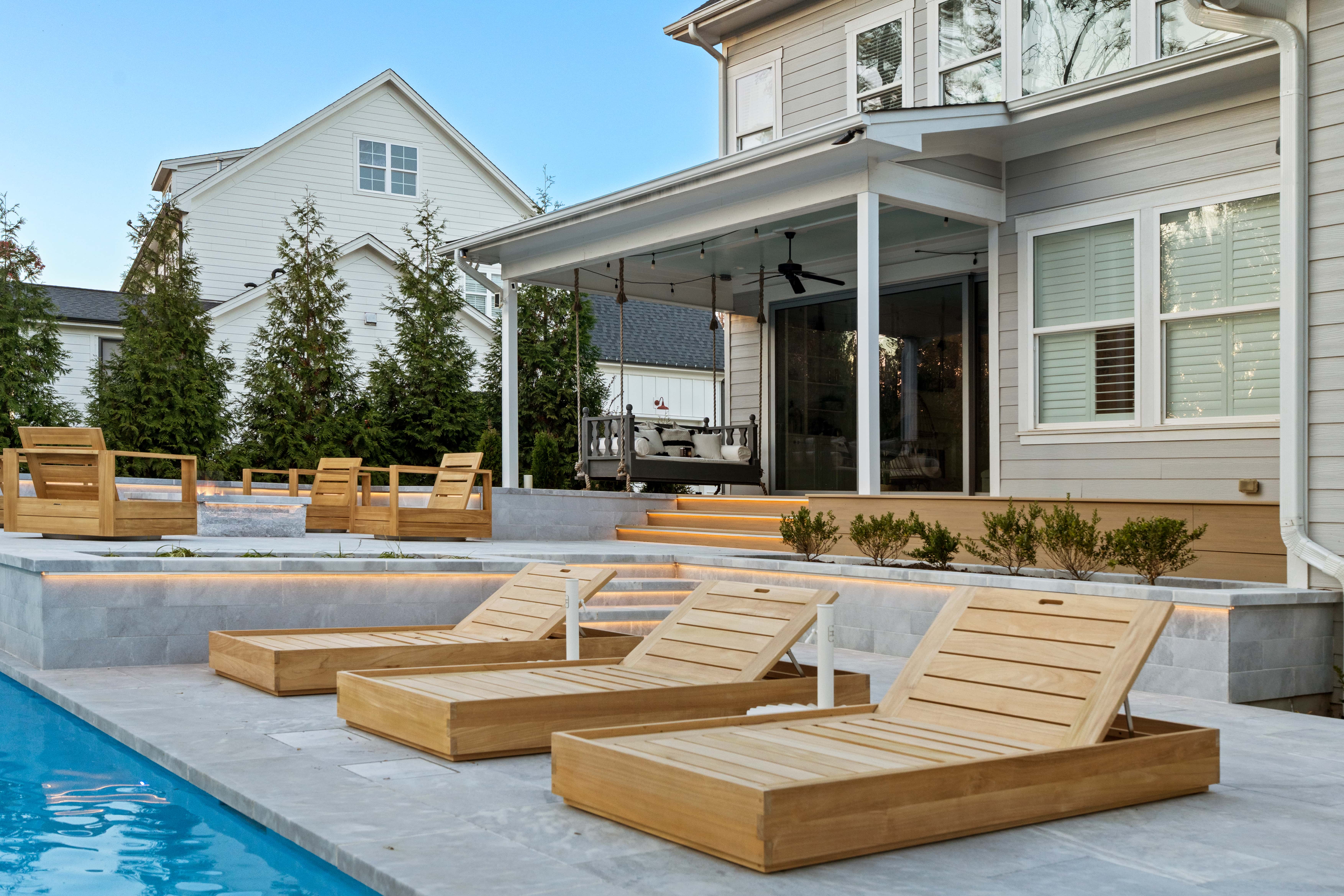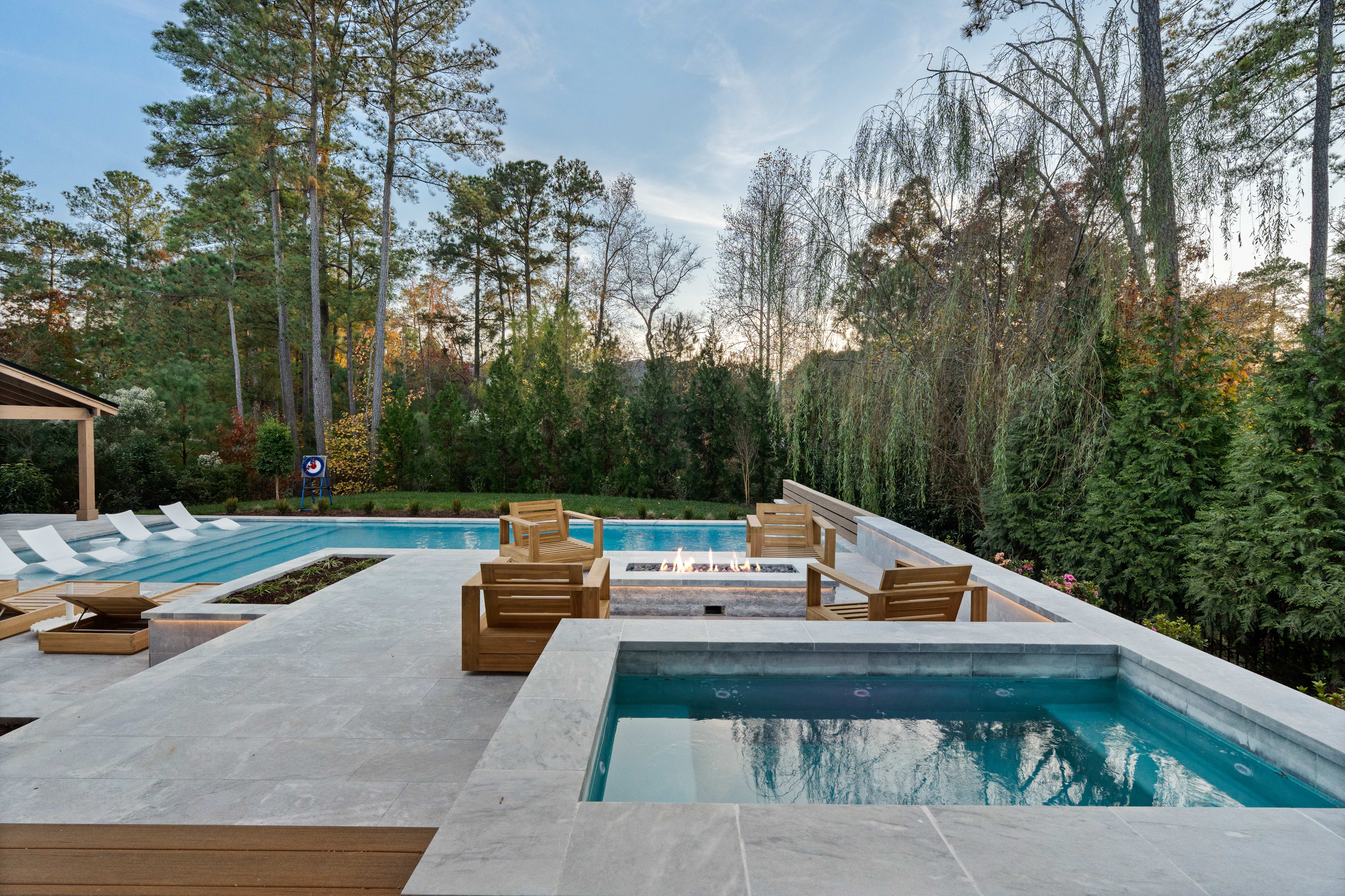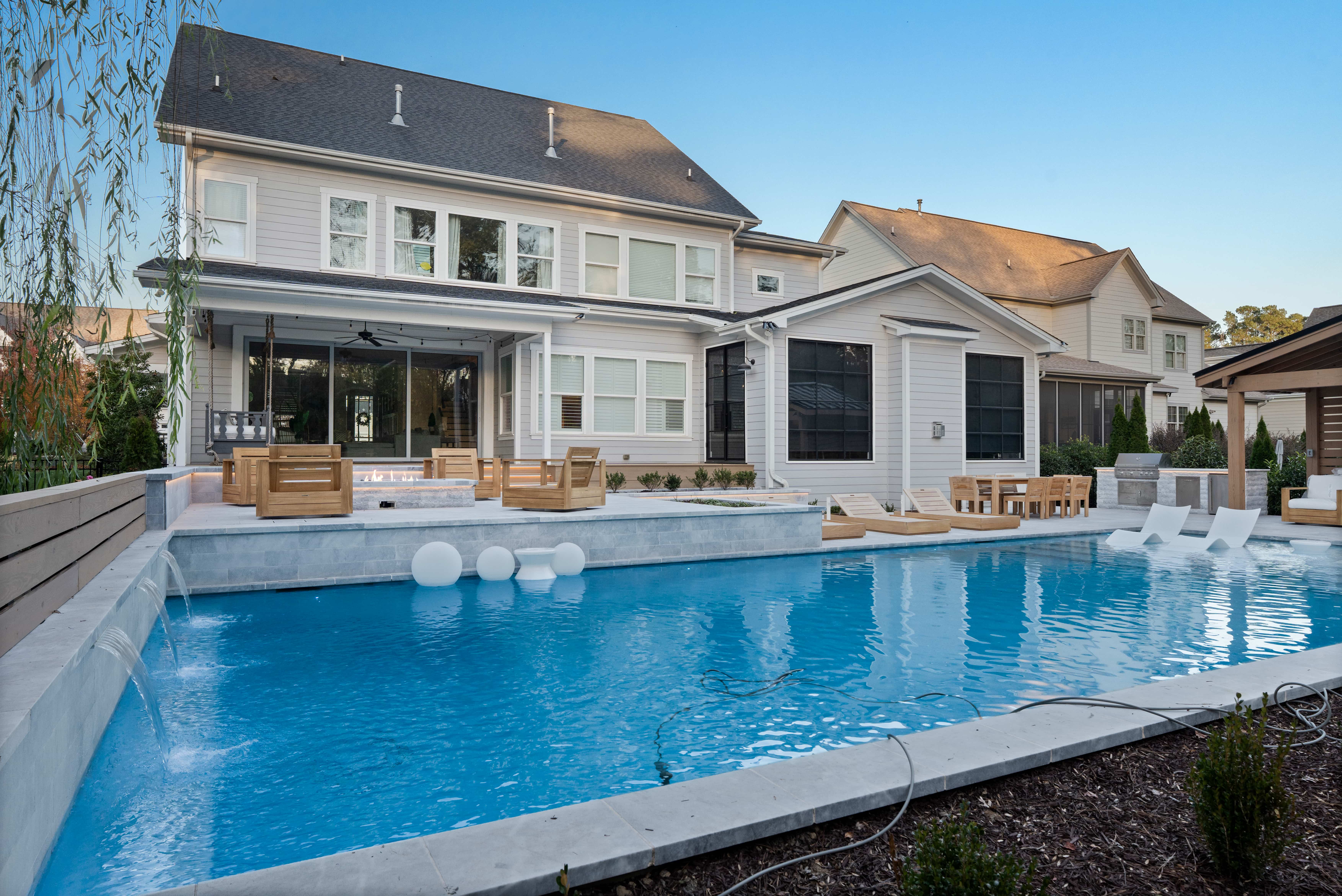 The design features a 20 foot by 48 foot swimming pool paired with a six foot by ten foot spa, each operating on its own system to allow independent heating and cooling. A gas fire pit rated at 400,000 BTUs provides warmth and ambiance, while a full outdoor kitchen and covered pavilion complete the space. Throughout the process, the homeowners were closely involved in shaping the design, resulting in an outdoor living environment that reflects their vision and supports how they plan to use the space for years to come.