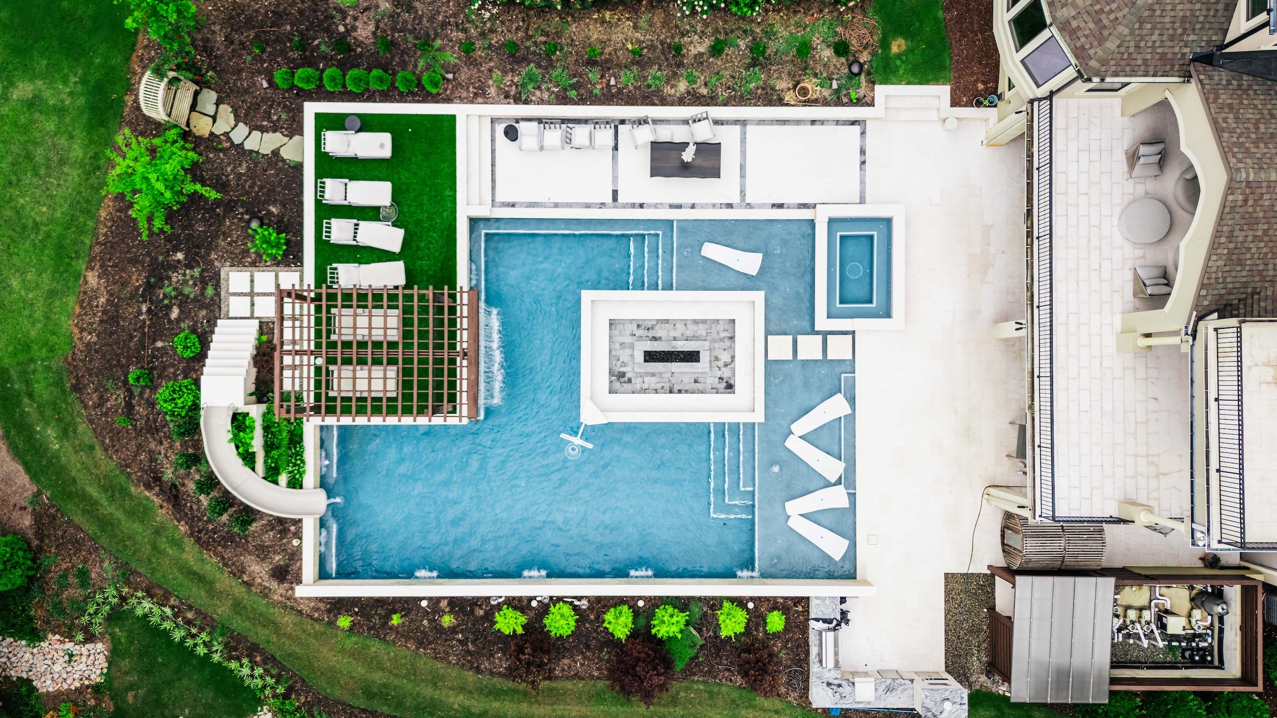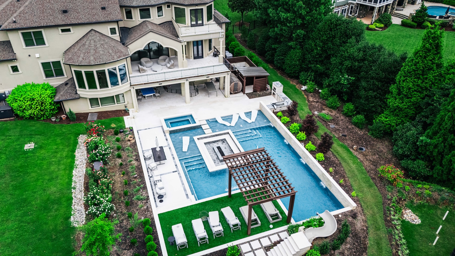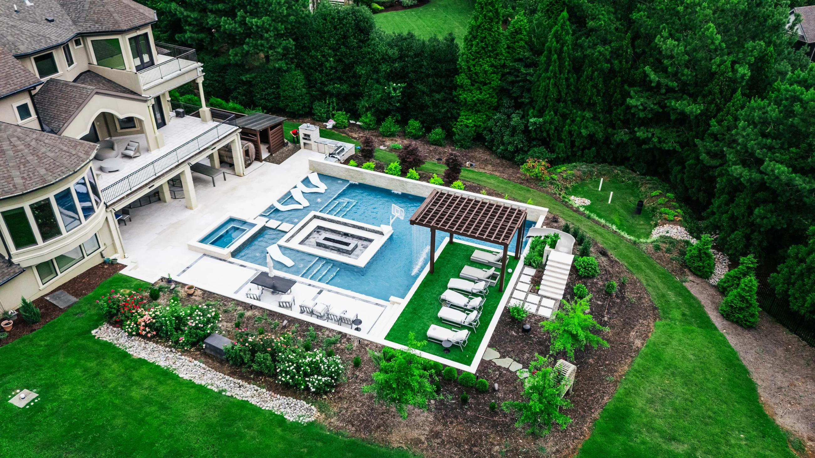 Through extensive design, engineering, and coordination, we were able to redesign and relocate the septic system, implement permeable hardscape solutions, and incorporate a rain garden to manage stormwater. These efforts allowed for the addition of a custom pool and more than three thousand square feet of outdoor living space. The finished design includes a pool with a centrally located fire pit, an outdoor kitchen, sauna, pergola with a rain curtain, integrated lighting, and a multi zone sound system. While the process took time and patience, the result is a highly customized outdoor environment that reflects both creative problem solving and thoughtful design.